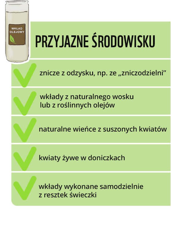 Alternatywą dla parafinowych wkładów są takie z wosków naturalnych, np. pszczelego lub sojowego. Niestety są one trudno dostępne na przycmentarnych stoiskach. Możemy jednak jako wkład wykorzystać np. świecę skręconą z arkusza wosku albo świeczkę z naturalnego wosku, którą znajdziemy w domu. Można wykonać też taki wkład czy świeczkę samodzielnie, rozpuszczając resztki świeczek, które już mamy.