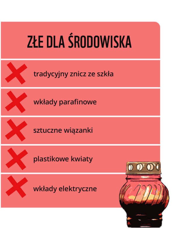Wiele zniczy ma też plastikowe elementy, które – o ile ich nie rozdzielimy od reszty znicza – także nie zostaną poddane recyklingowi. Kupując więc nowy znicz, przyczyniamy się do zwiększania stosu zalegających na składowiskach śmieci. Warto wiedzieć, że co roku, w okolicy 1 listopada, z każdego cmentarza wywożonych jest średnio 200 ton odpadów1. Lepiej niż kupować, jest więc wykorzystywać jeden lampion jak najdłużej się da, dokupując jedynie świecące wkłady.