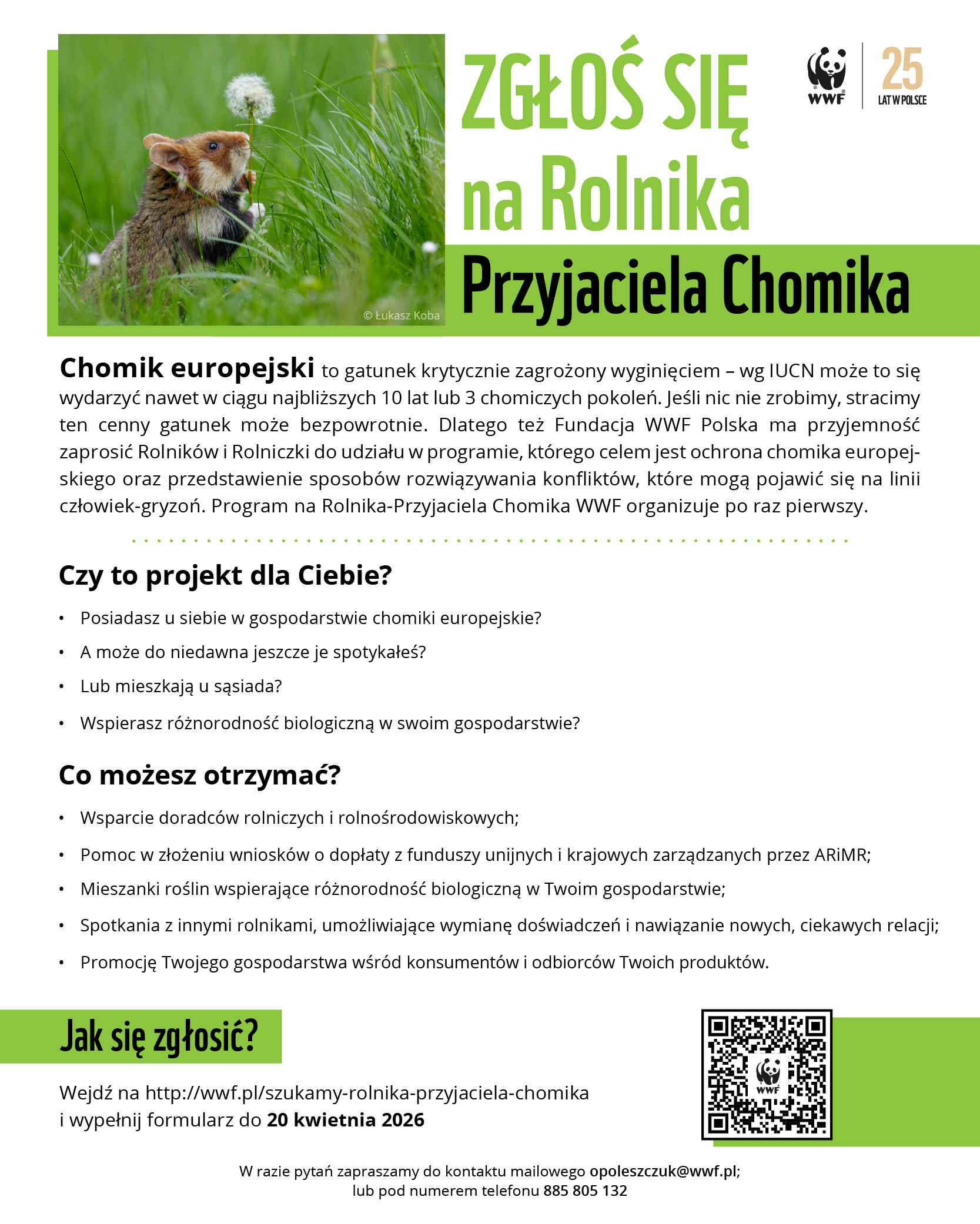 Chomik europejski to gatunek krytycznie zagrożony wyginięciem – wg IUCN może to się wydarzyć nawet w ciągu najbliższych 10 lat lub 3 chomiczych pokoleń. Jeśli nic nie zrobimy, stracimy ten cenny gatunek może bezpowrotnie. Dlatego też Fundacja WWF Polska ma przyjemność zaprosić rolników do udziału w projekcie, którego celem jest ochrona chomika europejskiego oraz przedstawienie sposobów rozwiązywania konfliktów, które mogą pojawić się na linii człowiek-gryzoń. Projekt na Rolnika-Przyjaciela Chomika WWF organizuje po raz pierwszy.